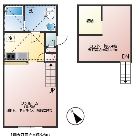オートロック・防犯カメラ・無料インターネット(Wi-Fi)・IH2口コンロ・浴室乾燥など。プリマでは3.6mの天井高を活かして、1階に位置する部屋にもロフトを設置しています。ロフトの高さは1.4mという余裕のある空間。寝室としてはもちろん、セカンドスペース、サブルームとして、入居者様のライフスタイルにあわせて自由に使い分けができます。